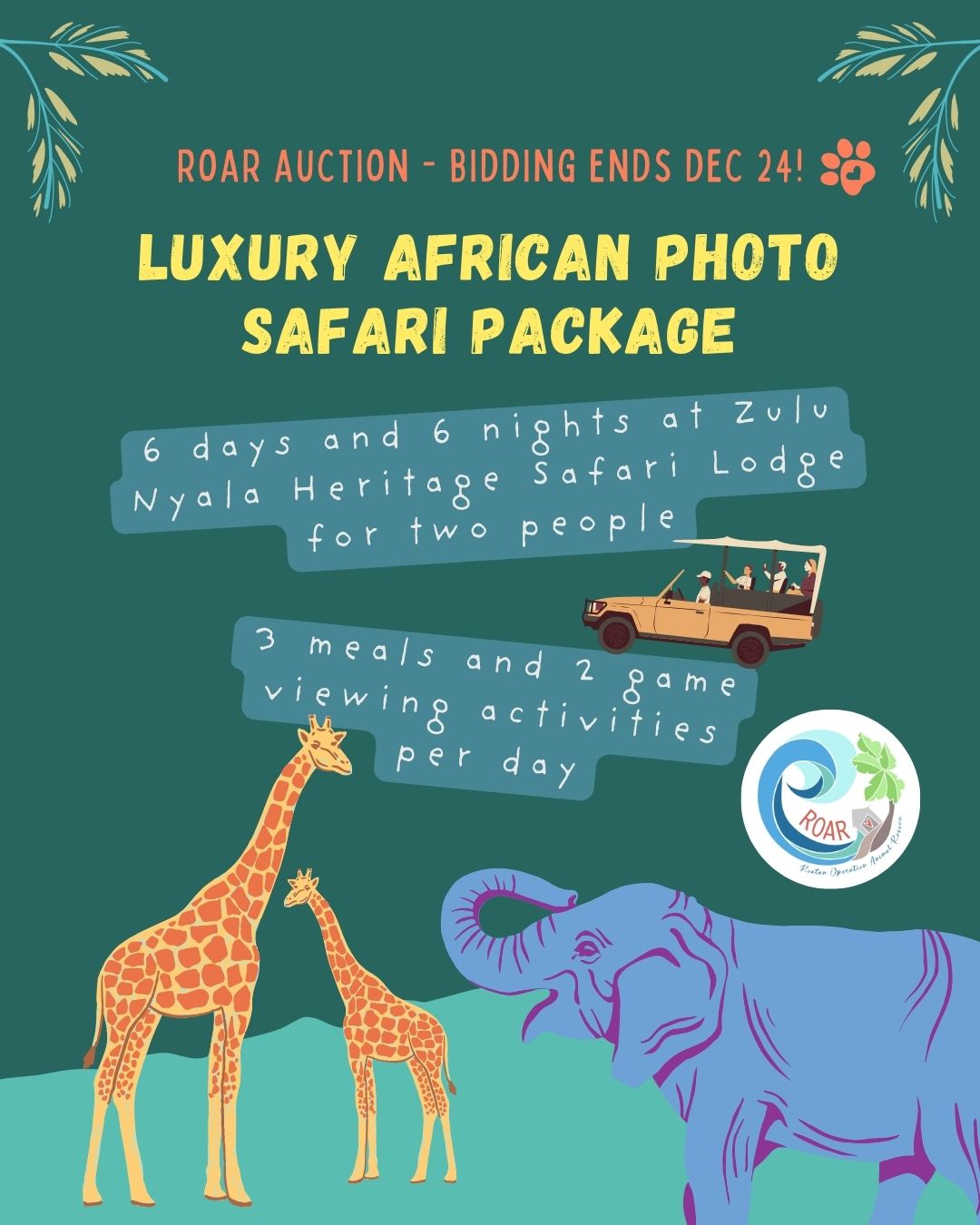 Place Your BidAdventure with purpose! 🌍🐾Treat yourself to a Luxury African Photo Safari for two (valued at $7,995). Bid knowing your contributions directly help animals on Roatan. 🦁🐘